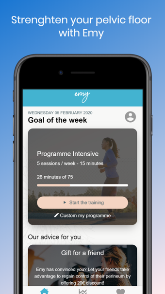 Emy is een gratis mobiele applicatie die speciaal is ontworpen om de bekkenbodemspieren te versterken. Met de app kunnen gebruikers eenvoudig Kegel oefeningen uitvoeren, waar en wanneer ze maar willen, met of zonder de slimme Kegel trainer. De sessies duren slechts vijf minuten en zijn gebaseerd op goedgekeurde therapeutische protocollen van bekkenbodemexperts. Gebruikers kunnen hun voortgang volgen via een grafiek en herinneringen instellen om hun oefeningen niet te vergeten.